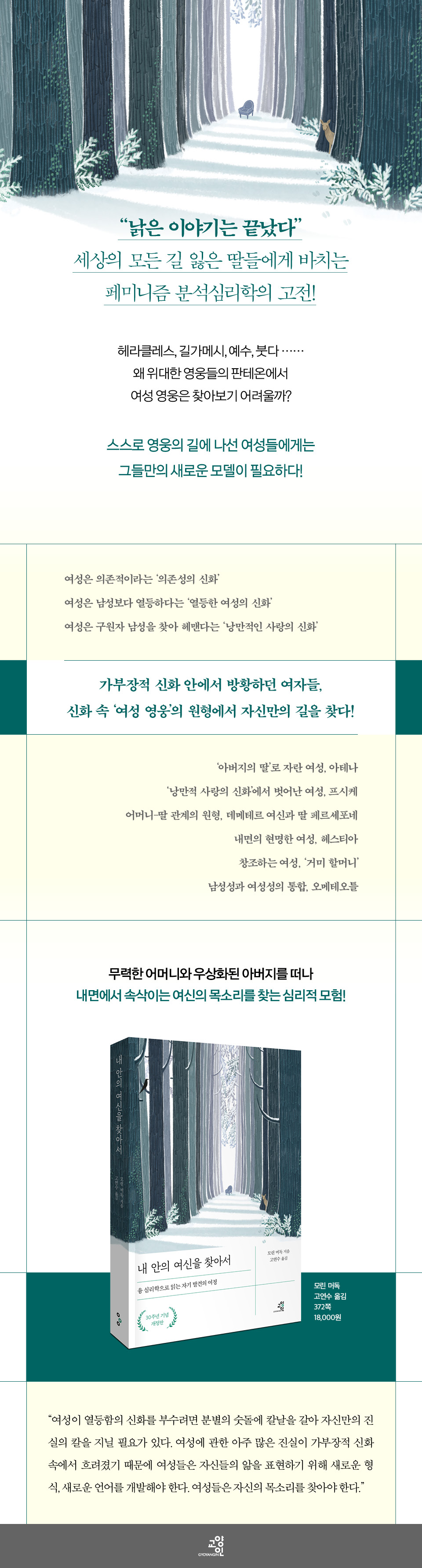 그런데 위대한 영웅들의 판테온에서 왜 여성 영웅은 찾아보기 어려울까? 여성의 영웅적 여정은 과연 어떤 모습일까? 융 심리학자이자 심리 상담가인 모린 머독은 1981년 9월 어느 날, 이러한 의문을 품고 직접 캠벨을 찾아갔다. 캠벨의 대답은 예상 밖이었다. “모든 신화에서 여성은 전통적으로 ‘거기’, 그 자리에 있습니다. 여성이 해야 할 일은 그저 사람들이 도달하려고 하는 곳이 바로 자신임을 깨닫는 것입니다.” 정말 그럴까? 《내 안의 여신을 찾아서》는 바로 그날 시작되었다. 오늘날 대부분의 여성들은 집에서 얌전히 영웅을 기다리고 싶어 하지 않는다. 스스로 영웅의 길에 나선 여성들에게는 그들만의 새로운 모델이 필요하다!
