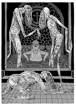 에리크 스베토프트는 《스파》에서 스파 호텔 전체를 뒤덮는 습기, 곰팡이, 진액을 얽히고설킨 여러 선으로 사람의 혈관과 비슷하게 표현한다. 호텔을 배회하는 사람과 괴물의 신체는 호텔 속 인물들의 부정적인 감정이 극심해질수록 기괴하고 과도하게 변형된다. 원초적인 불쾌감을 유발하는 에리크 스베토프트의 표현 방식은 공포 만화로 팬층이 두터운 이토 준지의 작품을 떠올리게 한다. 또한 H. P. 러브크래프트의 크툴루 신화, <에일리언> 시리즈에 나오는 괴기스러운 ‘크리처’에 열광하는 팬이라면 스파 호텔 곳곳에 나타나는 괴물들에 빠져들 것이다.