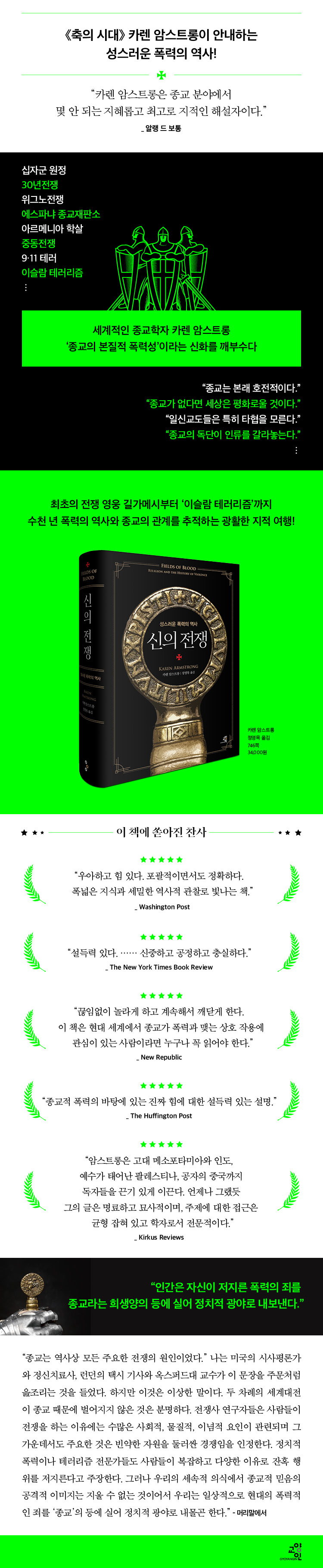 ‘종교의 본질적 폭력성’에 대한 역사적 규명을 시도하는 이 책은, 역사상 ‘종교적’ 전쟁, ‘종교적’ 폭력으로 불린 참상들이 실제로는 정치 투쟁의 결과에 가깝다는 진실을 드러낸다. 그러나 이 진실은 이 책에서 종교가 폭력의 문제에 아무런 책임이 없음을 주장하는 데 쓰이지 않는다. 오히려 암스트롱은 진정한 평화를 이루려면, 오늘날 세계 곳곳에서 인류가 겪고 있는 분열, 불화, 분쟁에 종교가 책임 있는 자세를 취함으로써, 공동체를 향한 공감, 연민, 배려를 증진할 수 있는 종교 본연의 영성 계발에 적극적으로 나서야 한다고 강조한다.