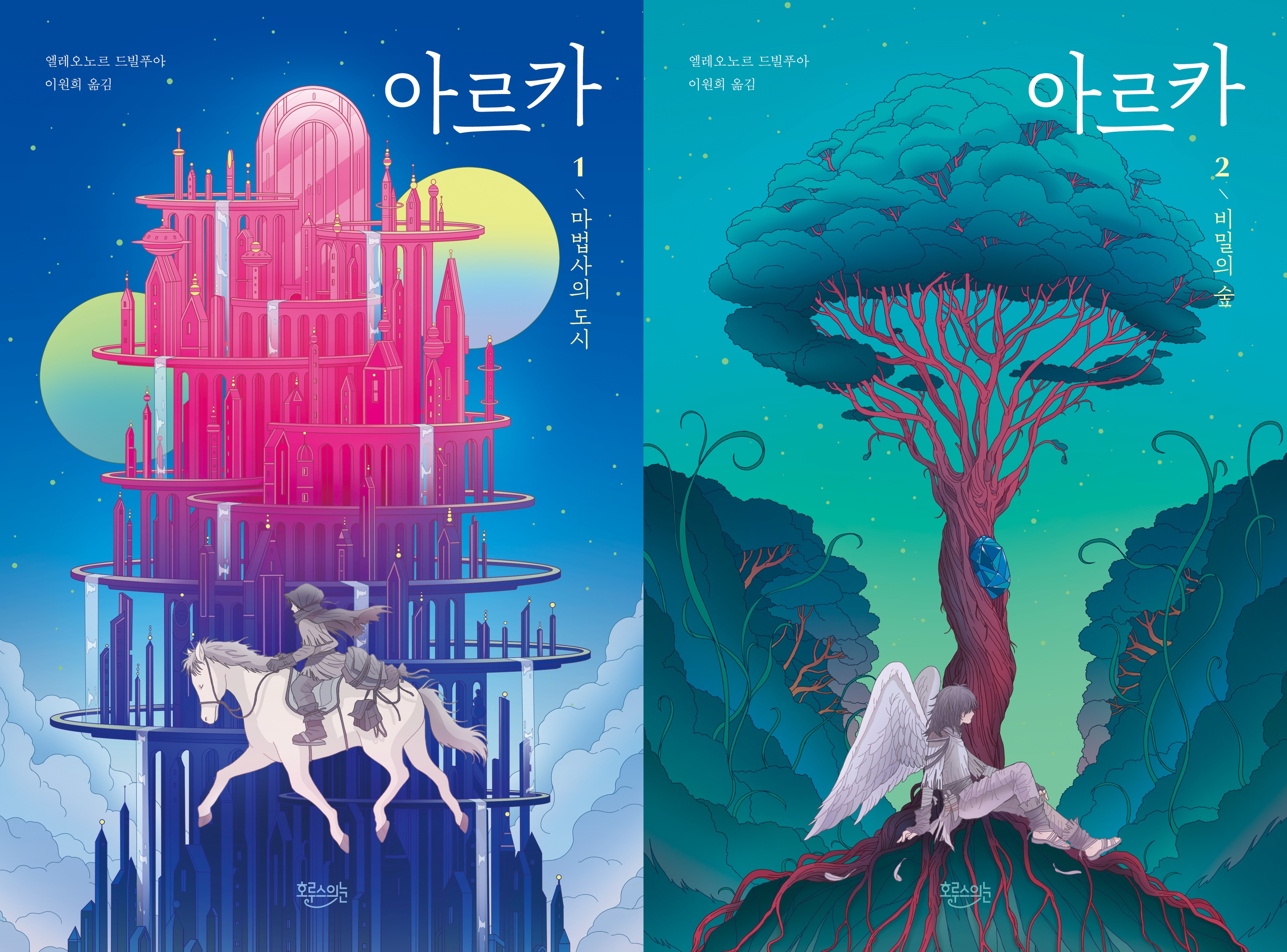 아르카는 도시에 들어서자 망토를 겨드랑이에 낀 채 고개를 쳐들고 거리를 둘러보기 시작했다. 멀리서 볼 때는 히페르보레아의 탑들이 갈대 줄기처럼 높고 가냘파 보였는데 가까이에서 보니 외관이 각양각색이었다. (…) 바로 그때 아르카의 시야에 90센티미터 너비의 커다란 거북이 들어왔는데 큰 통을 싣고 있었다. 초록색과 밤색 비늘이 덮인 늙은 등갑에는 이끼가 붙어 있었다. 앞쪽에 앉은 남자가 거북의 머리에 맨 고삐를 잡아당기면서 몰고 있었다. _ 1권, ‘웰컴 투 히페르보레아’, 41, 43쪽