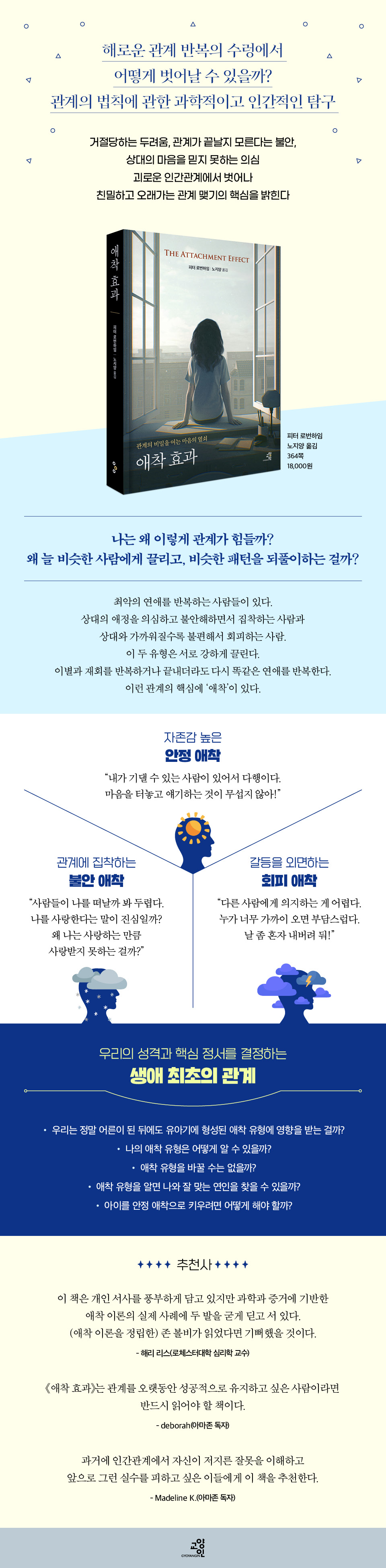《애착 효과》는 관계를 오랫동안 성공적으로 유지하고 싶은 사람이라면 반드시 읽어야 할 책이다. 이 책을 10년 전에 읽었더라면 더 좋았을 텐데. 이 책을 통해 사람들 사이를 연결하는 것이 무엇인지 이해할 수 있었다. - deborah(아마존 독자)