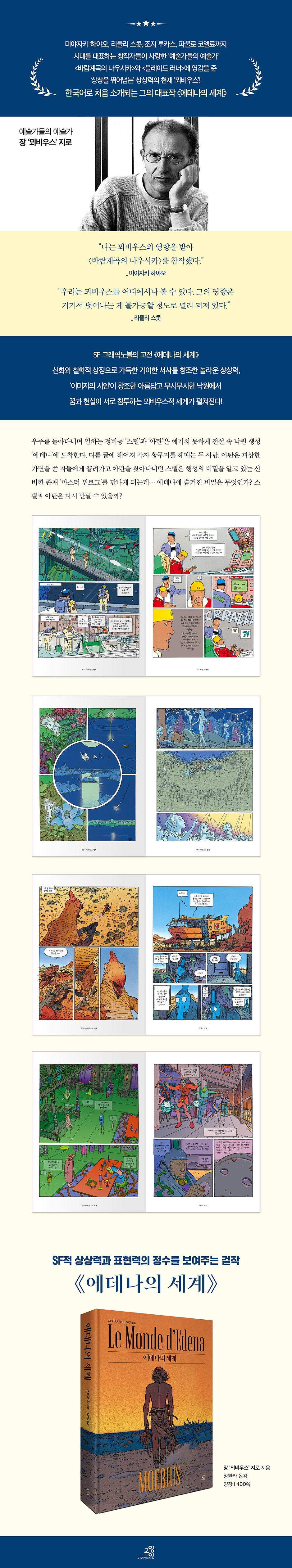 이제 뫼비우스의 SF 걸작 《에데나의 세계(Le Monde d'Edena)》가 처음 한국어판으로 소개된다. 이 작품은 이야기를 창조하고 그림으로 보여주고자 했던 걸출한 아티스트이자 스토리텔러 ‘뫼비우스’의 독특한 시각과 스타일을 보여주는 완벽한 예시로 손꼽힌다.