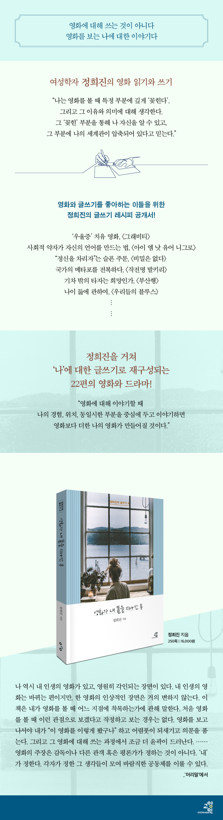 나 역시 내 인생의 영화가 있고, 영원히 각인되는 장면이 있다. 내 인생의 영화는 바뀌는 편이지만, 한 영화의 인상적인 장면은 거의 변하지 않는다. 이 책은 내가 영화를 볼 때 어느 지점에 착목하는가에 관해 말한다. 처음 영화를 볼 때 이런 관점으로 보겠다고 작정하고 보는 경우는 없다. 영화를 보고 나서야 내가 “이 영화를 이렇게 봤구나” 하고 어렴풋이 되새기고 의문을 품는다. 그리고 그 영화에 대해 쓰는 과정에서 조금 더 윤곽이 드러난다. …… 영화의 주장은 감독이나 다른 관객 혹은 평론가가 정하는 것이 아니다. ‘내’가 정한다. 각자가 정한 그 생각들이 모여 바람직한 공동체를 이룰 수 있다. - ‘머리말’에서