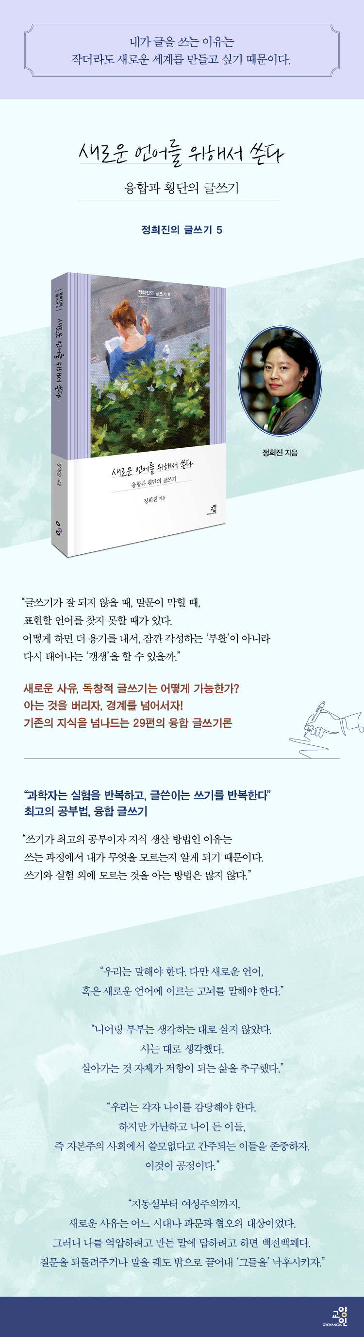융합은 단순히 지식을 끌어모으는 것도 아니고 모든 지식에 통달하는 것도 아니다. 융합은 지식의 경계를 가로질러 넘어가는 지적 작업이다. 정희진은 융합을 자연과학, 사회과학, 인문학 등 다양한 지식이 접촉하면서 발생하는 불협화음에서 새로운 앎이 탄생하는 과정이라고 정의한다. ‘정희진의 글쓰기’ 시리즈 다섯 번째 책 《새로운 언어를 위해서 쓴다》는 기존의 지식과 경계를 넘나들며 질적인 변화로 나아가는 ‘횡단의 정치’로서 융합을 논한다.