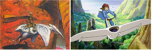 <바람계곡의 나우시카>(1984)에서 주인공 나우시카가 타고 다니는 하얀 글라이더는 뫼비우스의 <아르자크>(1975)에서 모티프를 가져온 것이었다. 미야자키 하야오는 자신이 1980년에 <아르자크>를 보고 큰 충격을 받았으며 뫼비우스의 영향 아래서 <바람계곡의 나우시카>를 만들었다고 밝혔다. 뫼비우스는 <바람계곡의 나우시카>를 보고 크게 기뻐했으며 자신의 딸 이름을 ‘나우시카’로 짓기도 했다.