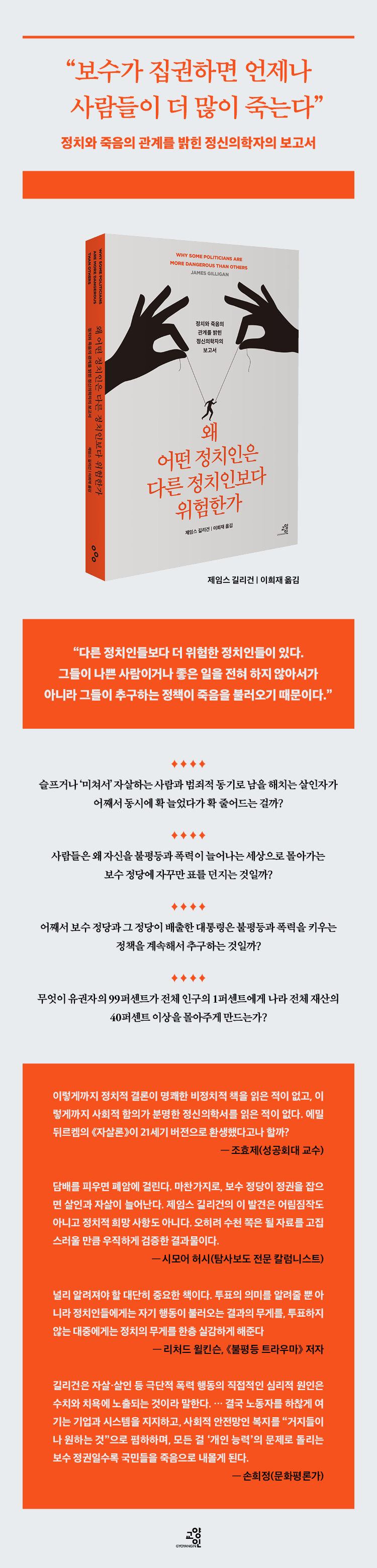 담배를 피우면 폐암에 걸린다. 마찬가지로, 보수 정당이 정권을 잡으면 살인과 자살이 늘어난다. 제임스 길리건의 이 발견은 어림짐작도 아니고 정치적 희망 사항도 아니다. 오히려 수천 쪽은 될 자료를 고집스러울 만큼 우직하게 검증한 결과물이다. 저자는 우리에게 이렇게 말한다. “우리가 어느 쪽에 투표하는지에 삶과 죽음이 달렸다.” _ <The New Yorker>(시모어 허시, 탐사보도 전문 칼럼니스트)